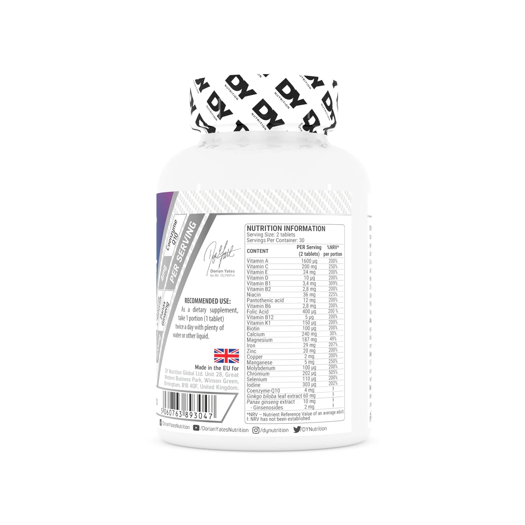 DY Nutrition Multivitamin Complex é um multivitamínico premium com 24 vitaminas e minerais essenciais, reforçado com Coenzima Q10, extrato de Ginkgo biloba e Panax ginseng. Foi desenvolvido para apoiar energia diária, imunidade, saúde cognitiva e bem-estar geral, especialmente em fases de maior desgaste físico ou mental.